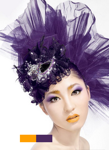 造型妝面中的紫色和黃色都降低了明度,分別是淺紫色和橙黃色,此款造型正是是通過控制色彩面積大小、降低色彩飽和度的方法使畫面中兩種強烈對比的色彩達到和諧共存的效果。