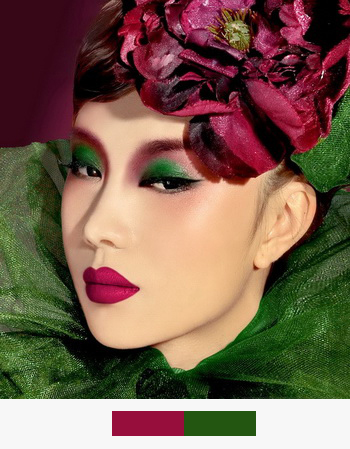 可以這樣說,在對比色或補色運用中,都可以通過調整其色彩的明暗度或飽和度使之達到平衡和諧的效果,比如妝面中的暗紅色和墨綠色搭配,內斂含蓄、時尚冷艷又不失個性的美感。