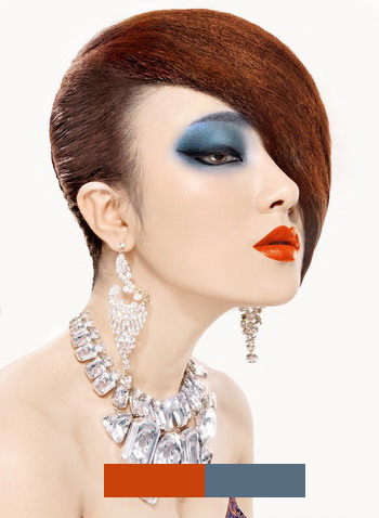 高飽和度的橙紅色唇妝和低飽和度的桔棕色發(fā)色搭配,使原本暗淡沉寂的妝容立顯華美光鮮。因此,這款妝面是通過恰當?shù)难a色運用和高低飽和度對比運用達到畫面和諧的。