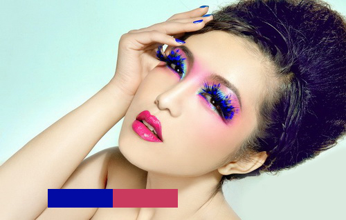 桃紅色是紅色中加入了少量的紫色調和而成的,在色相環(huán)中,與緊鄰的藍色形成對比關系。桃紅色浪漫艷麗,藍色冰爽清涼,兩種亮色碰撞如冰火相溶,視覺上對比強烈。用藍色花紋羽睫粘在眼部,用桃粉色眼影大面積暈染眼瞼,使妝面于強勢中帶著一股柔媚的氣質。小面積翠綠色眼影和淺藍色的背景呼應,使整個畫面既個性冷艷,又亮麗清爽,又有視覺上的沖擊力。