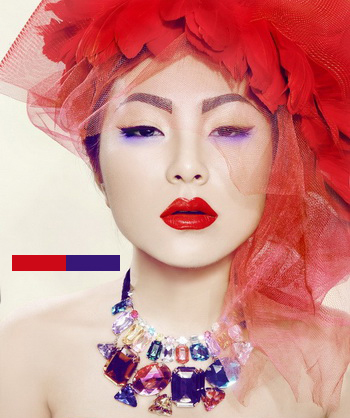 對比色運用妝容效果:有著鮮明的色相感,效果強烈、醒目、有力、活潑、豐富、興奮,但易產生視覺疲勞,處理不當會有煩躁、不安定之感。