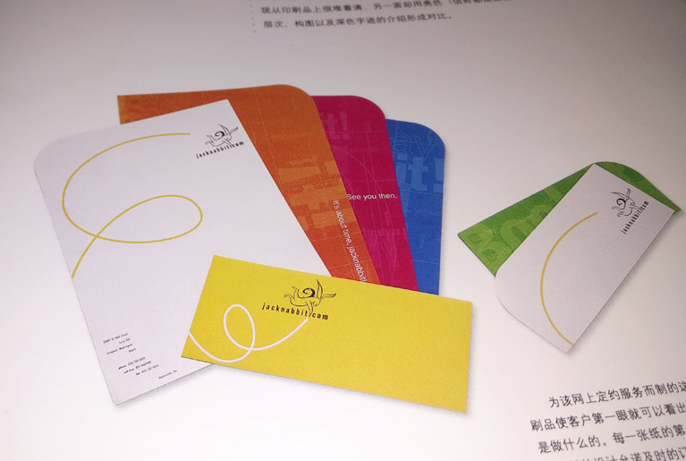 每一張紙第一面設(shè)計(jì)都以簡介為期特色,公司標(biāo)語和一條螺旋形的線條搭配和諧,令人愉快,而網(wǎng)站“.com”名字上的微小紅色圓點(diǎn)卻很是耀眼?,F(xiàn)從印刷品上很難看清,另一面卻用亮色(信封都是提前印刷的),顏色、層次、構(gòu)圖以及深色字跡的介紹形成對比。