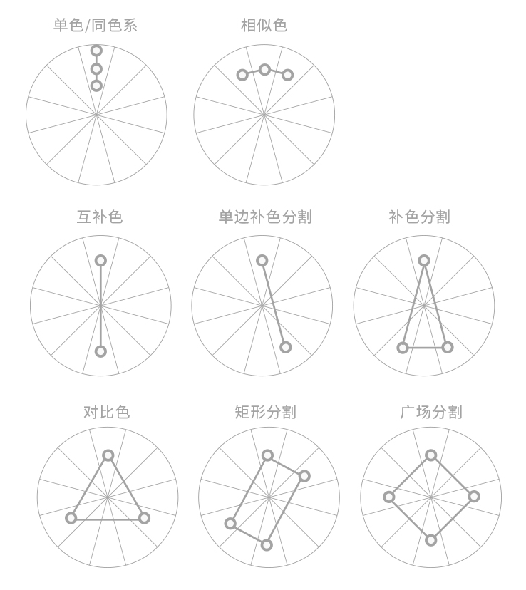 我們常見的配色方式有同色系、相似色、互補色、對比色搭配,這里在互補色里面劃分出了補色分割(與互補色相鄰的兩邊的顏色)以及單邊補色分割,此配色方式的目的是為了讓配色在形成鮮明對比的情況下又能有較高的融入度,較互補色而言柔和很多,補色分割在emart廣告里面用的很多。而矩形分割、廣場分割則是在多色搭配情況下出現(xiàn)的配色方式,下面我們單獨舉例說明每個配色方式。
