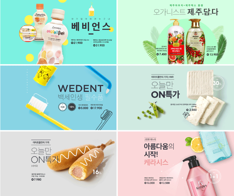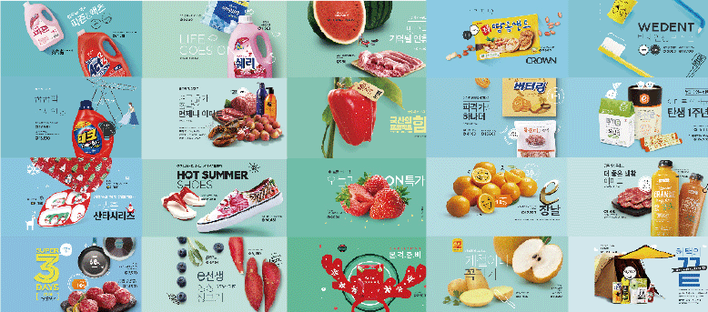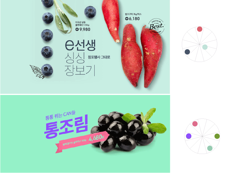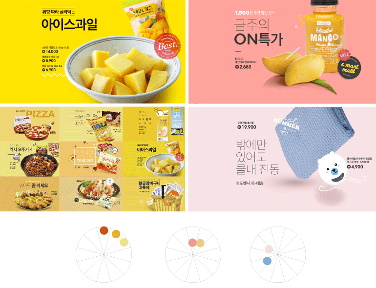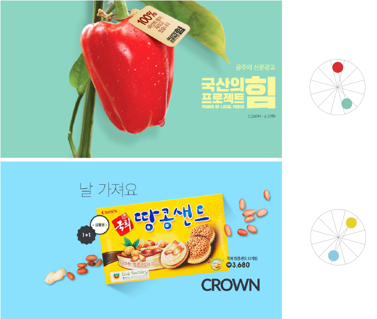 我們發(fā)現(xiàn)emart直接用互補色設(shè)計的案例并不多見,主要還是在補色分割范圍內(nèi)的應(yīng)用變化,這樣既能達到很好的視覺對比效果又能使畫面融合度較高。這里挑選了幾個補色系里面比較有代表性的搭配方式,整個畫面視覺配色上相當(dāng)活躍,主產(chǎn)品很突出,是一種很贊的傳達方式。